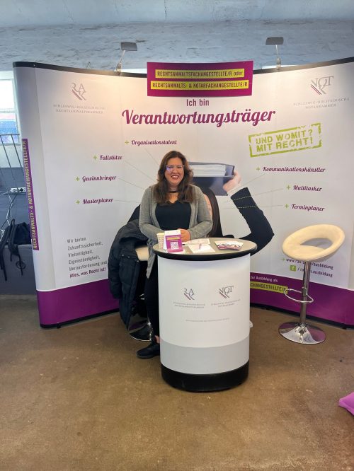 Vom Dienstag 15.10. bis Mittwoch 16.10.202426 fand die BerufsInformationsBörse (öffnet in neuem Tab)in der Nordmarkhalle in Rendsburg statt. Unsere Rechtsanwaltsfachangestellte Nihal Savas (super! vielen Dank, liebe Nihal!) hat sich den Fragen Ausbildungsplatzsuchender sowie von Lehrer:innen, Eltern und sonstigen Interessierten gestellt.