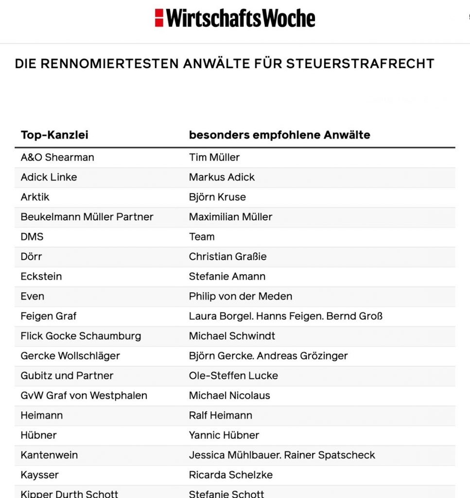 Die Wirtschaftswoche hat wieder einmal die „Top-Kanzleien“ für das Steuerstrafrecht (öffnet in neuem Tab) gekürt, und auch Gubitz und Partner ist wieder dabei – wie schon im Februar beim Wirtschaftsstrafrecht. Auch unser Partner Dr. Ole Lucke wird erneut als besonders renommierter Anwalt empfohlen.
